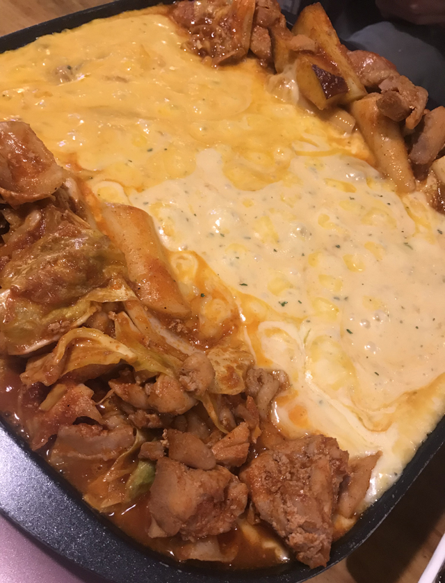 とりあえず飲み物とチーズタッカルビを注文すると…早っ! 30秒で出てきました! まさか飲み物より先に出てくるとは!!! お客さんのほぼ全員がチーズタッカルビを頼むので、おそらくすぐ出せるように常に準備されてるんでしょうね。