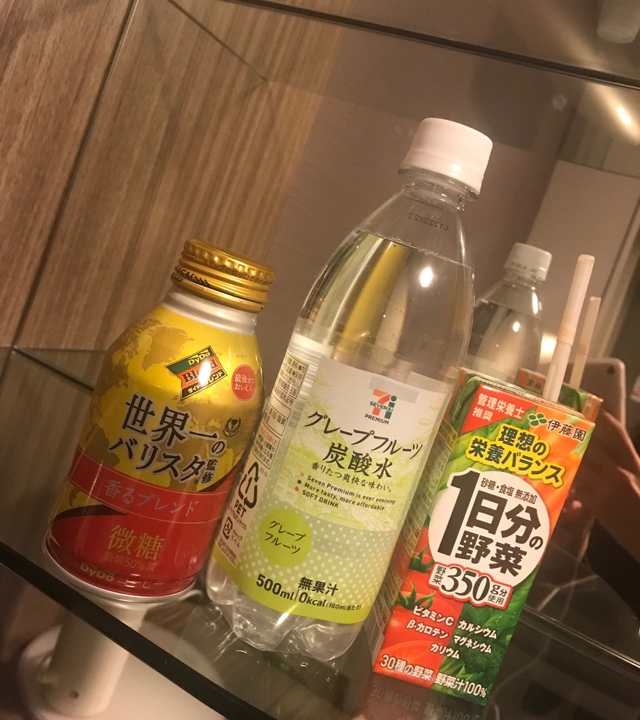 一通りの飲み物をゲットします。だいたいコーヒー、炭酸水、野菜ジュースってパターンが多いですかね。