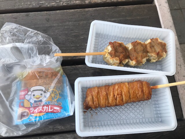 まず、行きのサービスエリアで茶色い食べ物地獄してみる(笑)。ライスコロッケ、ジャンボシュウマイ、肉巻き串と…。さらに、豚串も食べちゃいました。