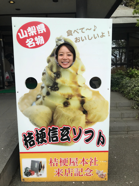 記念撮影を済ませて「桔梗信玄餅工場テーマパーク」をあとにしました。ドすっぴん失礼! のんびり旅行は化粧なんてしません~化粧時間の分、畳でゴロゴロするんですから! さて、お次は…