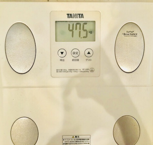 47kg台に戻りました。しかもこれ、朝にカレーパンと炒飯食べた後なんです。本当に何も気にしないで食ってやがるって感じでしょ(笑)。