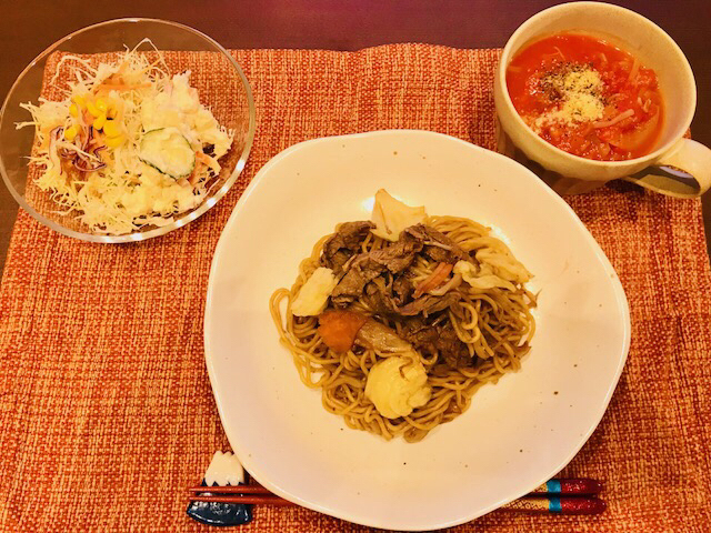 焼きそばです。誰がやっても美味しくできるから良いよね(笑)。