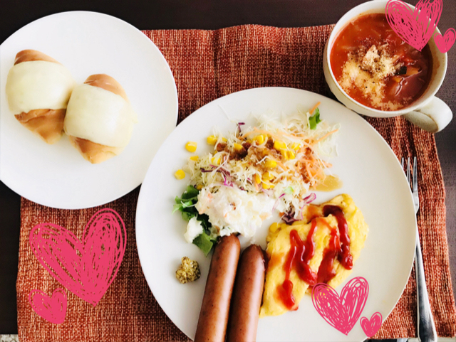 全部簡単だけど、パン朝食のこだわりは、パンは焼くだけにはしないこと(謎のこだわり)。…というかウィンナーデカすぎ(笑)。