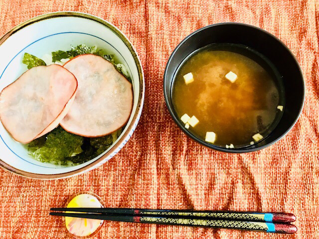 ハムをバターで焼いて、そのフライパンでご飯を炒める。バターライスの上に海苔をちぎって、ハムをのせて完成。味噌汁はお土産でいただいたインスタントのもの。3分でできるからカップラーメン級のスピード料理です。