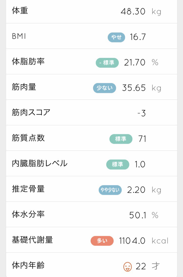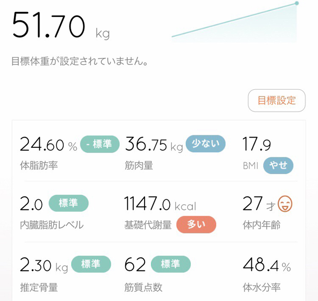 とりあえず体重48kg台、体脂肪22%弱、体内年齢20台前半を目標にやってみようかなと思います。