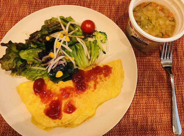 コンビニでサラダと野菜スープを買って、チーズオムレツを焼いてみた。なくなりかけのケチャップを使ったせいでベチャベチャになったのはご愛嬌(笑)。