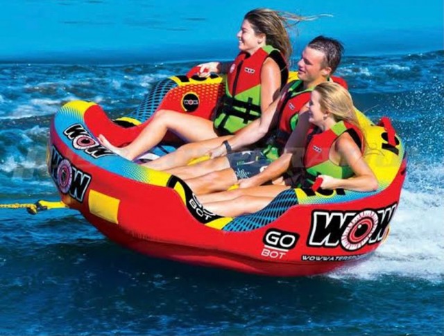 このボート、バナナボートとは違って持ち手を離しても壁があるので海にはなかなか落ちないんです。その結果、つる子さんがボート内でトランポリン状態になりました。