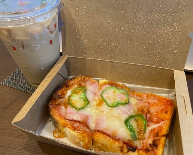 右手で化粧をして、左手でピザパンを食べる(笑)。