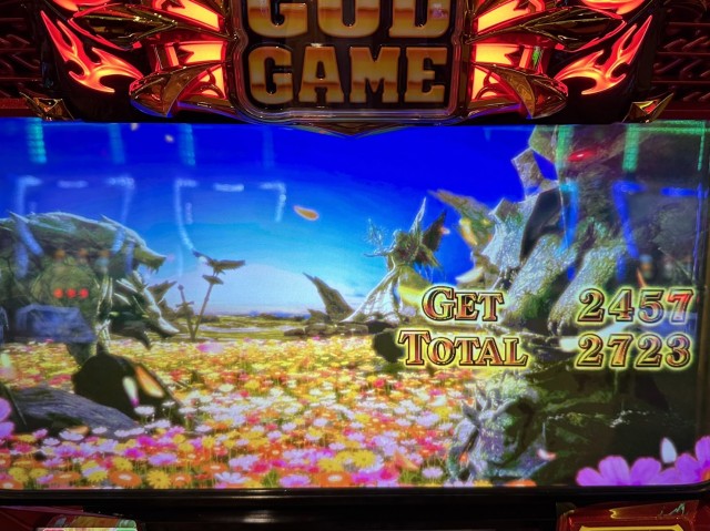 途中、隣で打っていた人がGOD揃いしたけど、それよりも連チャンが長く続いて、より多くの出玉を獲得した。