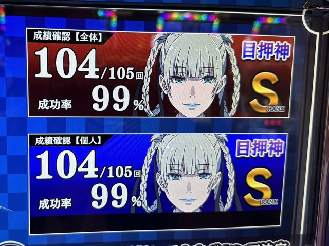 夢子の技術介入は状況に応じてその価値が全然違うので、目押し成功率別の機械割という数値は出せないだろう。ただ、体感上では成功率が90%ぐらいでも機械割はかなり下がりそうだった。