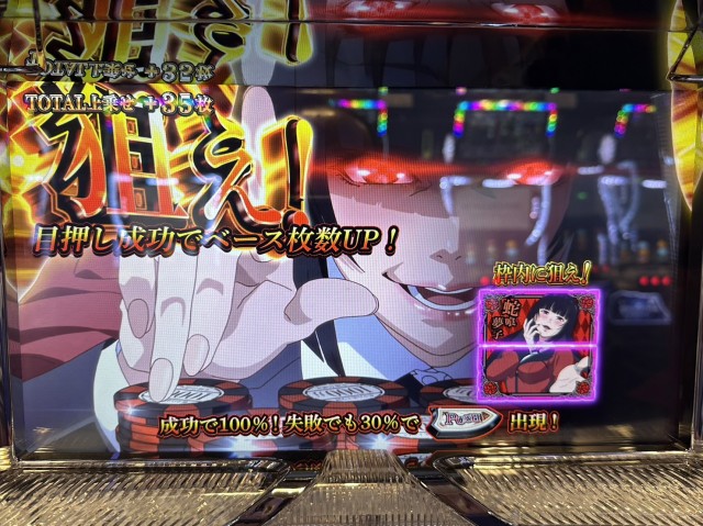 ちなみに、一度目の失敗は目押し…というよりも押し順ミス。夢子の技術介入時は基本的に右リールを第1に押すのだが、