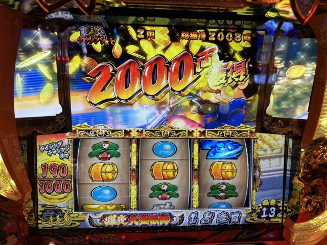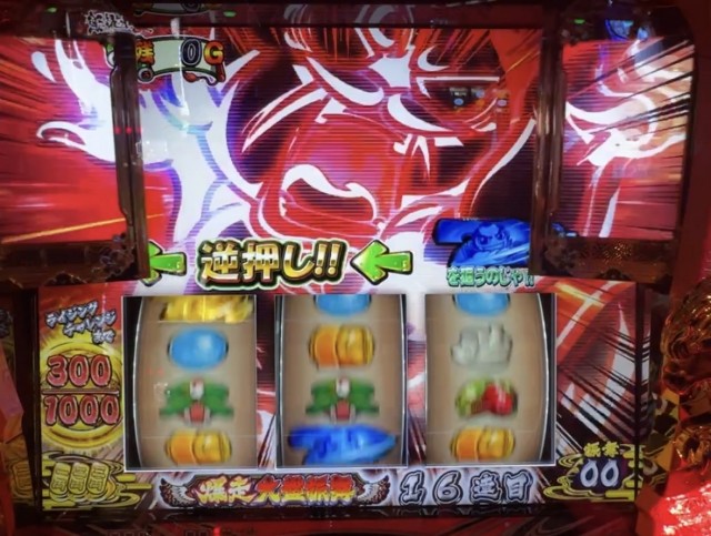 エンディング後も八代将軍チャレンジに突入して、ここで成功すれば上位AT濃厚なのでレバーを叩く手にいつも以上の力が入るというものだ。で、選択した告知パターンは爺。