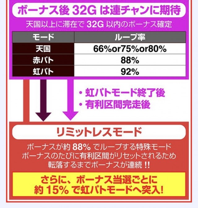 リミットレスモードとのループで大量出玉の獲得が狙える。実際、一撃万枚、一撃コンプリートの報告もある。ただ、夢が広がるゲーム性なのだが、
