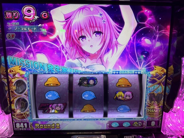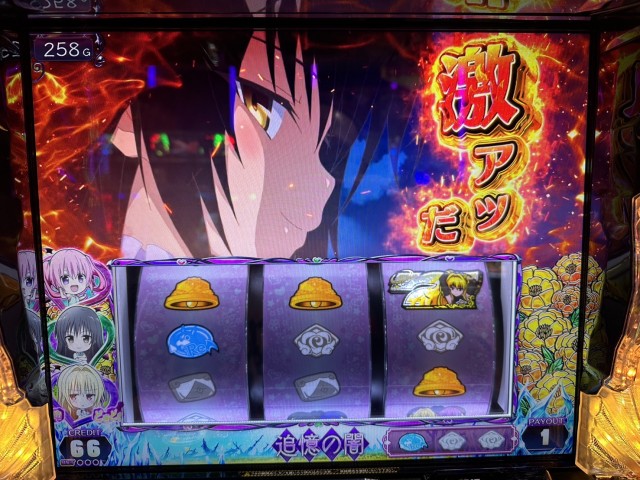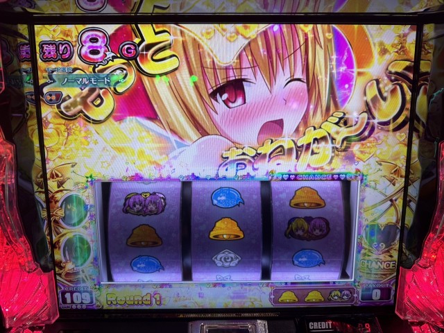 規定ゲーム数によるボーナス当選時はヤミ演出を経由し、右チャンス目はヤミ(&モモ)図柄。そう、ヤミ(&モモ)運が急激に良くなったのだ。