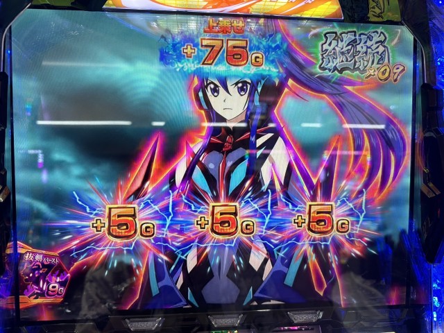 この機種を知らない人のために簡単に説明すると、抜剣バーストはギアフラグ(強チャンス目みたいなやつ)の超高確率状態(約1/7)で、ギアVアタックは上乗せ特化ゾーンだ。5号機の『黄門ちゃま喝』で例えると、紅炎モード(紫)+印籠チャンスみたいな感じだ。