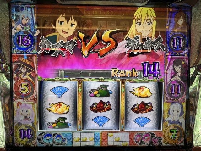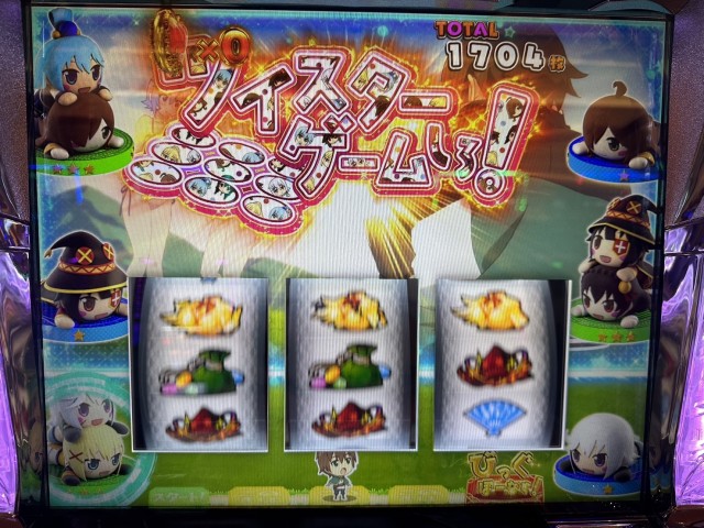 どうして、こんなになったのかというと、アクア→めぐみん→ダクネスと最初の3周期がどうも超高確だったっぽくて、お風呂ゾーンに計10回以上入ったのだ。となると、レベル4の可能性が非常に高い。そして、思い出すのは非有利区間での成立役。