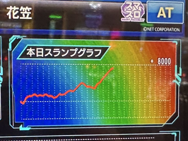 『花笠』の初打ちで、この機種の売りである初当りの軽さと天国の移行しやすさを体感して出玉を伸ばしつつ、中段チェリーを引いてそこから大連チャン。