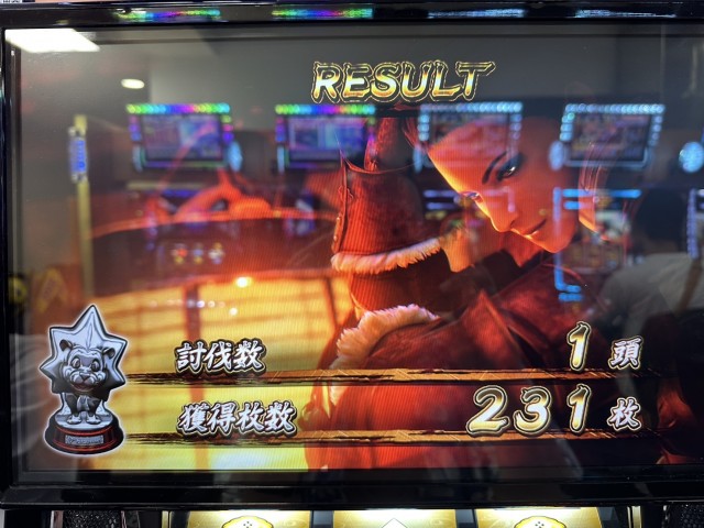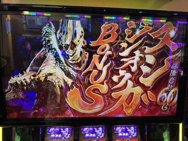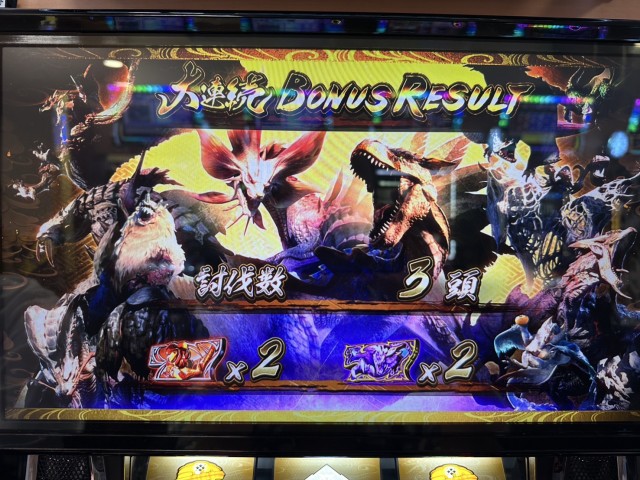 その直後、紫7ボーナスから再びヌシ・ジンオウガが登場した。そして、討伐に成功して再び大連続ボーナスが訪れた。