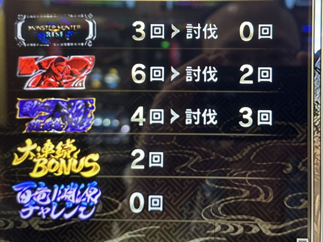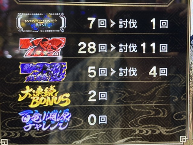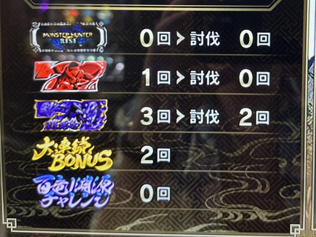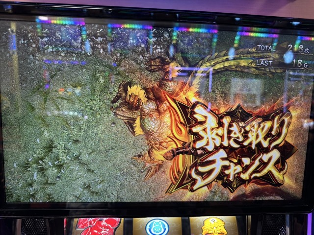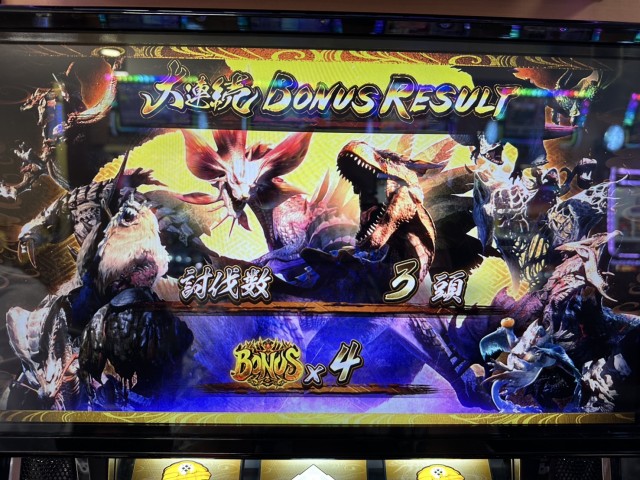 残念ながら新パネルは確保できなかったが、旧パネルで打つのならこれだなという狙い台は確保できた。そして、このモンハンライズでは怒涛の展開が訪れた。初当りは大きくハマって投資が嵩んだものの、