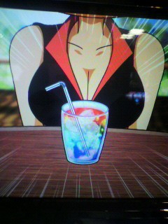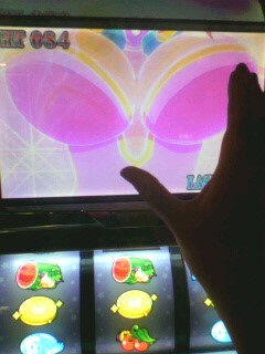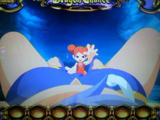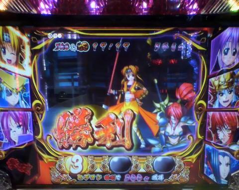 『ドラゴンギャル~ルーと伝説の黄金龍~』で、構図が私好みのエロさ。たしか、この演出は一瞬しか映らなかったので、携帯を構えていないと撮れなかった…ような記憶(曖昧)。ちなみにゲーム性は、天ボーナス・闘ボーナスという2種類のボーナス(擬似ボーナス)があったということは覚えているが、詳しいことは忘れた。そもそも、タイトルの「ルー」が誰なのか思い出せない。“藪からスティック”の人とか、グレミー・トトに求愛された人しか心当たりがない。