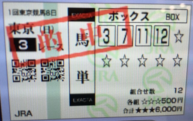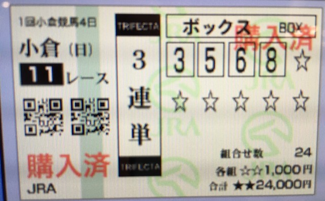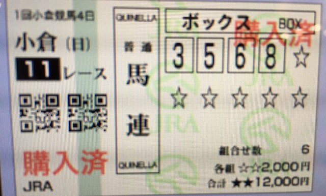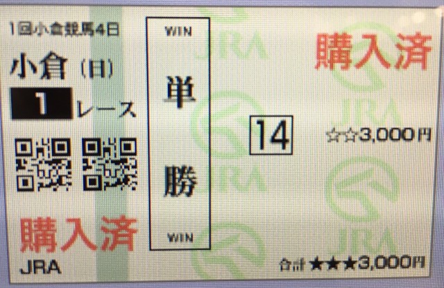 まずは1レース目(小倉競馬場)で、軽くジャブ。これはハズれてしまったが、いつもと違って投資額を抑えているので3000円の負債で済んだ。
