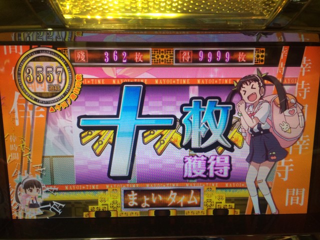 朝の並びは多くて私は後ろの方の番号を引いてしまったが、朝イチから『パチスロ化物語』を打つ人はあまり多くなくて余裕で台を確保。