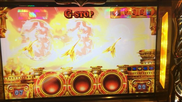 青7・3連からG-STOPに当選。本日3回目のG-STOPで、本日3回目のGG当選が確定。そして、残された図柄は3つ…と、ビックリするほど、3づくし。