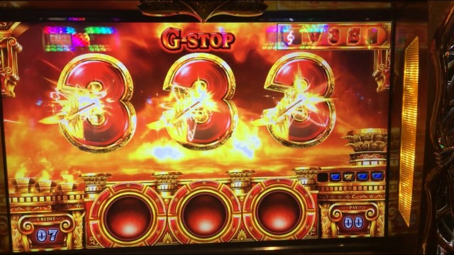 すると、GG後100Gほどで、青7・3連からG-STOPに当選して再び「3」揃い。
