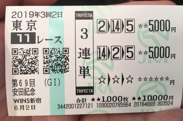欲張らずにボックスで勝負すれば良かった。もし、ボックスだったら1点2~3000円で賭けていたと思うので、「5>2>14」のオッズが437.2倍だったから、80万~130万円になったわけだ。