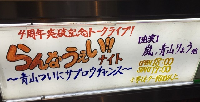 嵐・青山りょう氏の人気動画番組「らんなうぇい」のトークライブにお呼ばれしたからだ。なんでも、当日は青山りょう氏の36回目のバースデーとのこと。こんな記念すべきイベントに参加できたのは、本当に嬉しい限りだ。