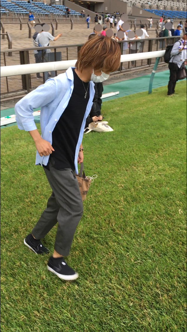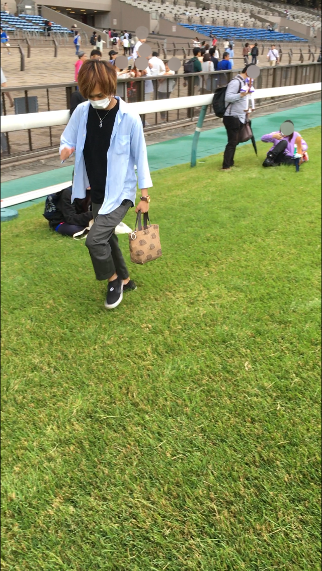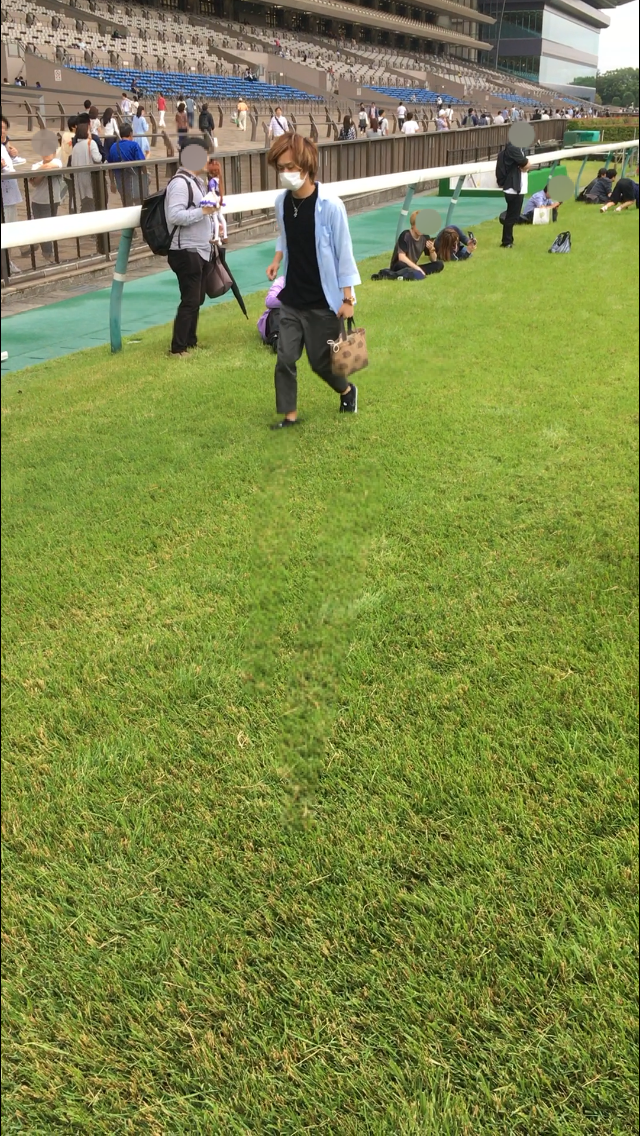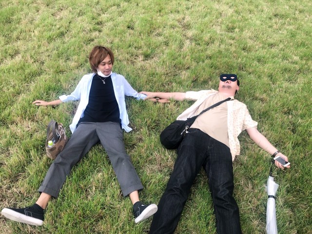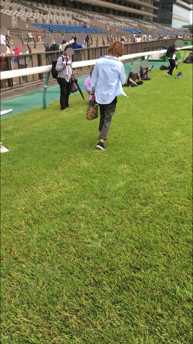 2人でゴロン、全身で東京競馬場を味わおう。手を繋いでまるでカップルのようだ。