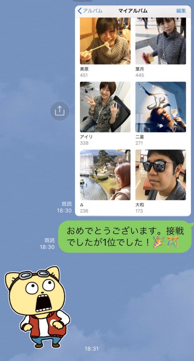 2位の葉月氏とは6枚差という大接戦。以前、動画企画で皆と一緒に箱根旅行をしたとき、アホみたいに大量の写真を撮った影響が大きい。また、仕事で一緒になる機会こそ少なめだが、一度に撮る量がアホみたいに多いのも1位になった要因のひとつだ。
