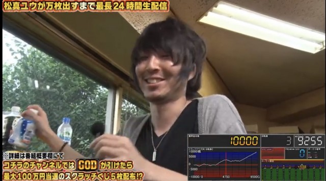 で、1週間前。後輩ライターの松真ユウ氏が「万枚出すまで生配信」という企画で凱旋を打った。