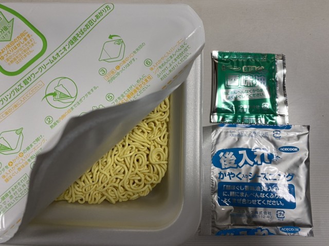 最初は粉末ソースの中に、今は亡き『バソキヤ(サンヨー食品)』のようにフライドポテトが入っているのかと思ったが、かやくはパセリと玉ねぎのみだった。