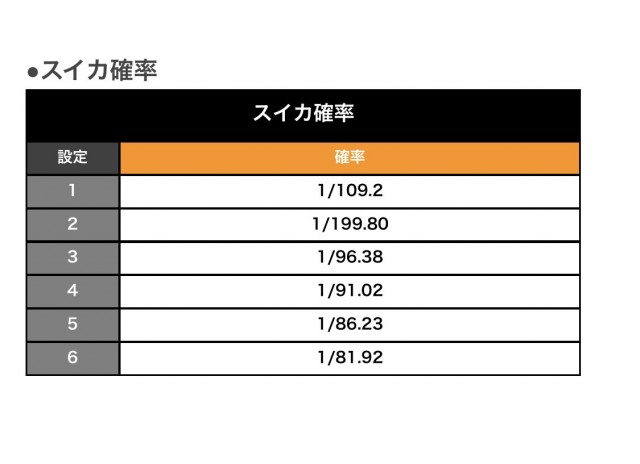 基本的に高設定になるほどスイカ確率は上がっているが、設定2のみ極端に低くなっている。そして、そんな設定2の機械割は設定1以下の96.0%。