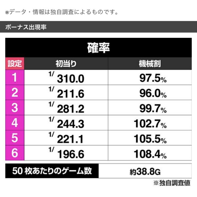 AT中のアピールタイムがかなり重く感じた。詳細は不明だがAT中の状態移行率に設定差があって、設定2は冷遇されているのだろうか。
