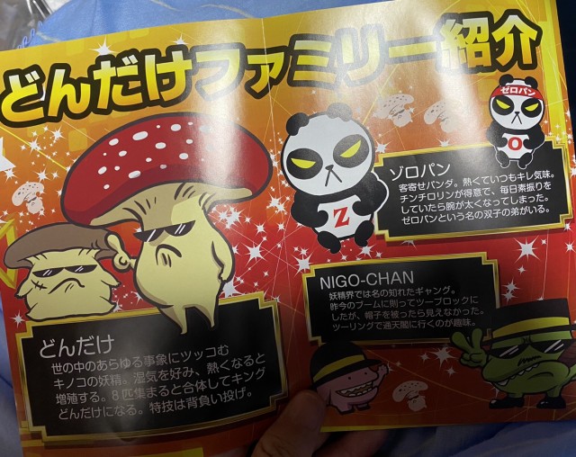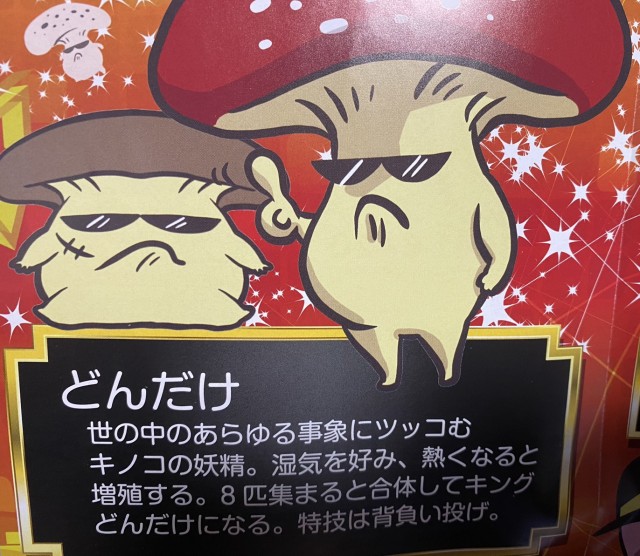 世の中のあらゆる事情にツッコむキノコの妖精。湿気を好み、熱くなると増殖する。8匹集まると合体してキングどんだけになる。特技は背負い投げ。