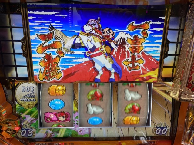 打ったのは『吉宗3』。どうしてこの機種にしたのか、その理由は簡単で「一富士、二鷹、三○○」演出がとても縁起が良くて正月っぽいから、それを拝みたくてチョイスした。ちなみに派手な割に特別アツい演出ではない。