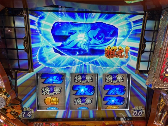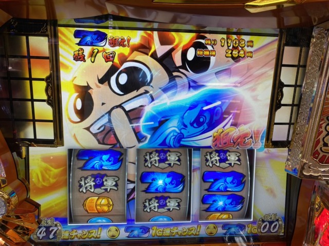 600G以降のBIGだから、将撃の可能性がアップしている。最後の望みを捨てずにBIGを消化。軽快なBGMで3つの特化ゾーンの文字が踊っている。「十五代の夜」が最後まで残れば将撃確定で逆転のチャンスがある。というか、来なければ逆転は絶望的だ。