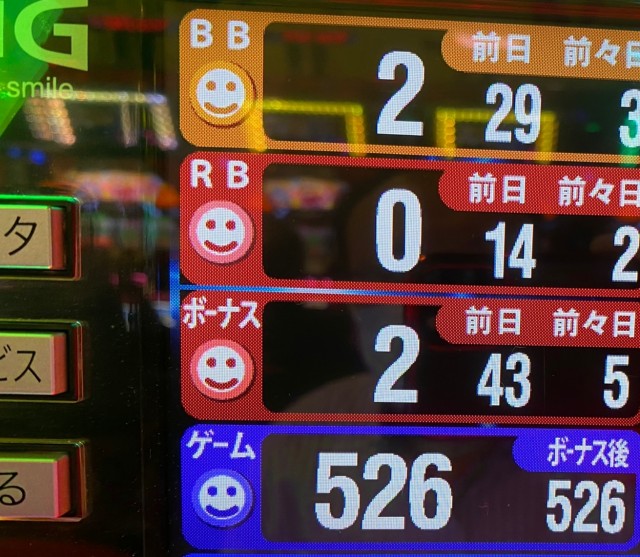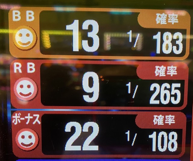 AT後もしばらく打ち続けるも、上手くボーナスが引けず。気付けば、REG出現率は設定2の近似値までダウンしたので、ここでヤメ。
