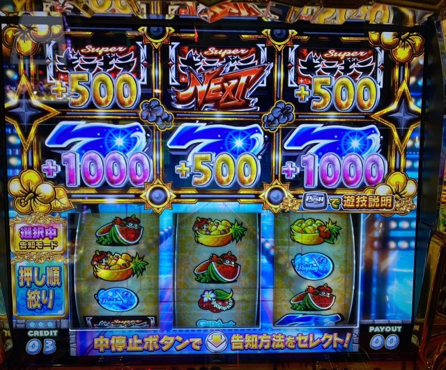 ATの初期差枚数決め。最初から2400枚はなかったので、ここはNEXTかレア役を引いて昇格させたいところ。最悪、1000枚でもOKだ。