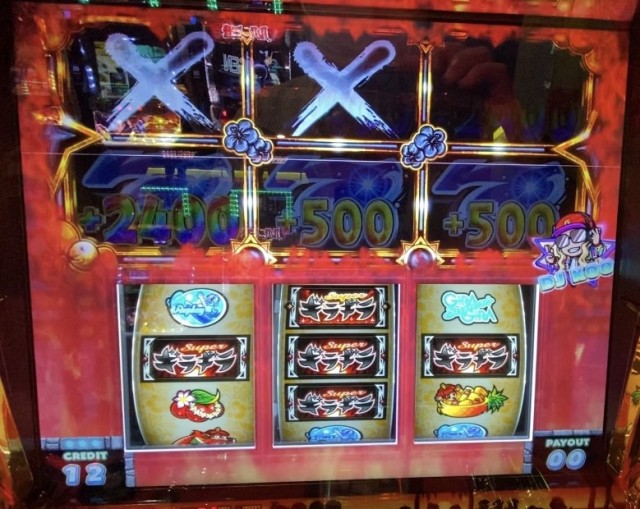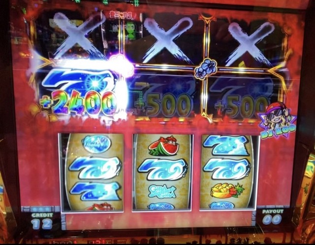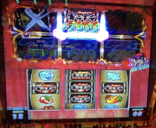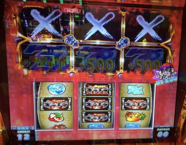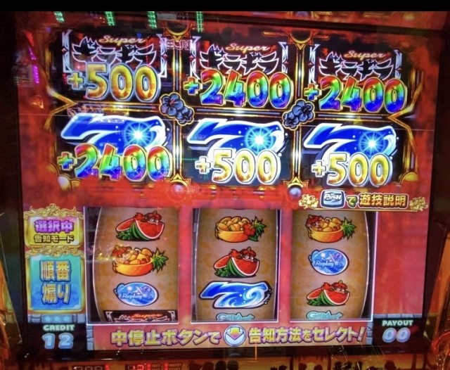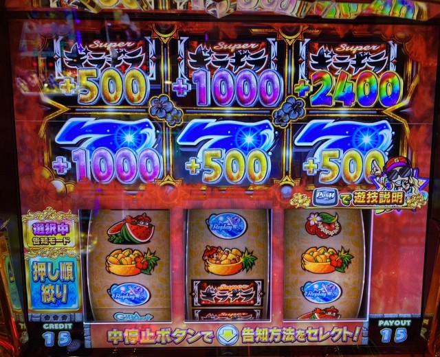 と思いきや、CZ開始時のチェリーで3G上乗せして12Gスタート。BARを狙え確率は1/14.9なので、これなら余裕でチャンスが来るだろう。さあ、目指せ2400枚!!