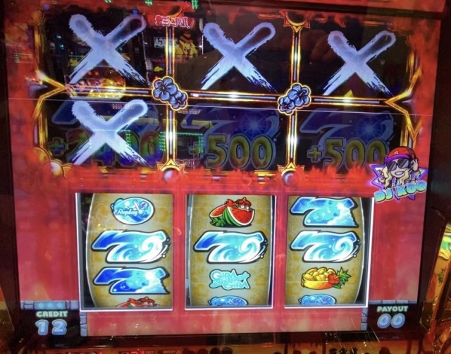 …って、終了時にレア役が成立しているではないか。BARを狙えは一度も発生しなかったので、この時点でのAT期待度は50%超。アッツアツ!