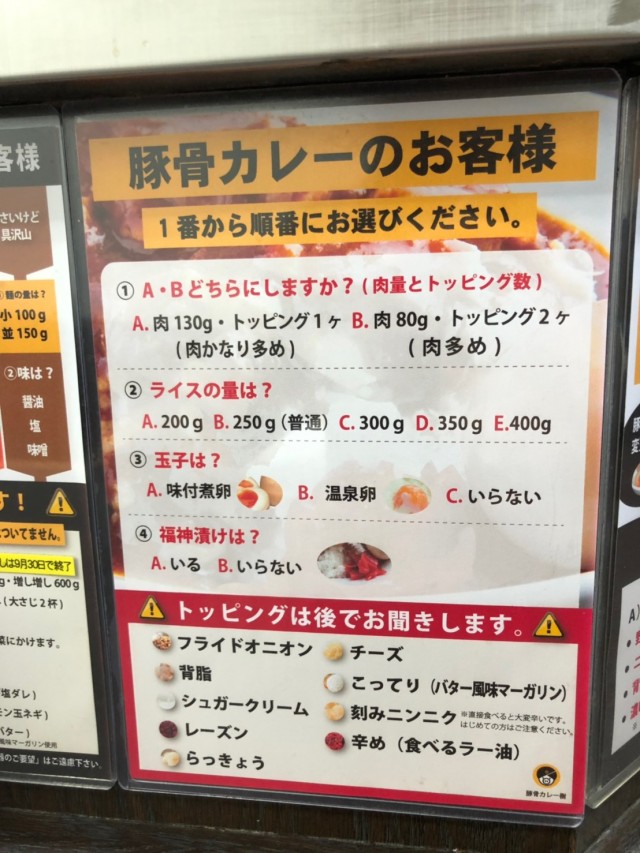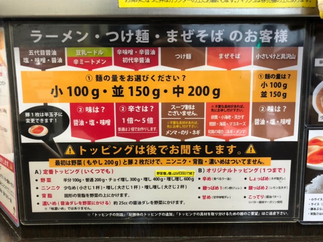 お店に入り食券を購入、食券をマスターに渡した後、目の前にある選択肢から量やトッピングを選ぶだけでスムーズに注文できるようになっているので安心です。