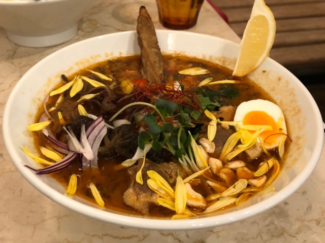 標準で味玉(半分)が入っているにもかかわらず、トッピングで味玉追加してます。うん、タンパク質大事な!