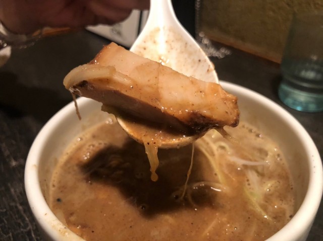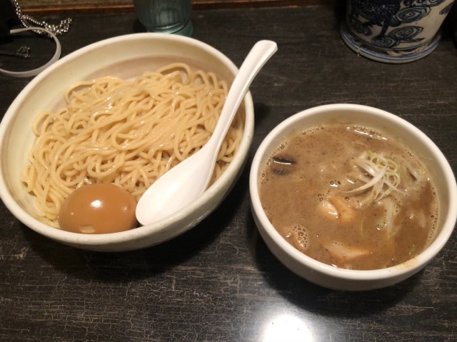 つけ汁には味玉とメンマ、ゴロゴロしたチャーシューが入っていて食べ応えあり。
