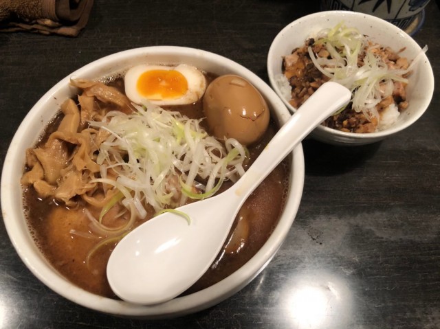 ということで、この日同行してもらったぱちタウンの中の人2号は「魚出汁正油 味玉焼豚ソバ」(1,100円)と「ミニ丼豚辛めし」(200円)をオーダー。