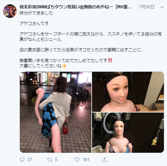 桜木彩音(@ayaayaayane9797)のように、1人でアヤコさんを抱えてススキノを練り歩くのもNGでしょうね。社会的に。