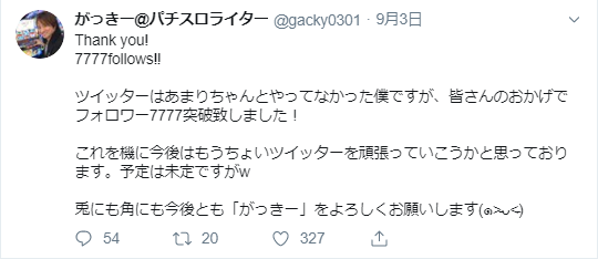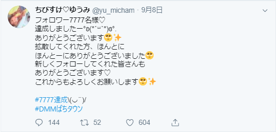 他に7,777人を達成しているのが、彩瀬友里加(@RCF_YuLica)、果生梨(@kaotibeam0518 )、熊谷知花(@kumagaichika )、倖田柚希(@yu_zukizuki )、沙弥(@saya20026527 )、ナミ(@nami__0620)、MYME(@MYME1202)、水木美帆(@Mizuki_Miho_ )、美穂(@miponi_0620)、ヤドゥ(@yadoo_max )、山崎ひびき(@ymzk_hbk )(五十音順)。