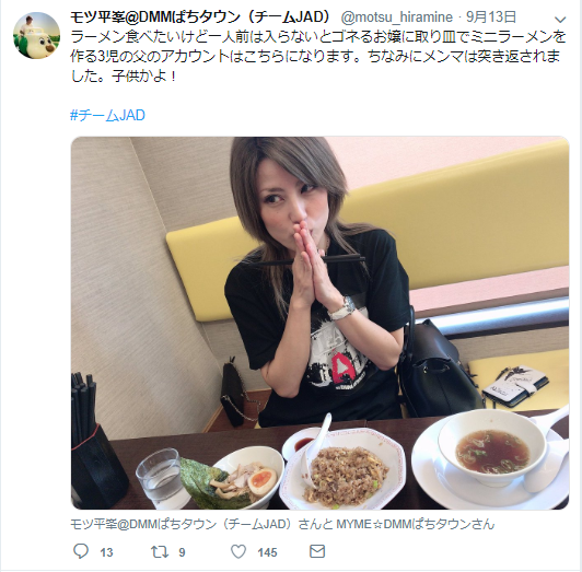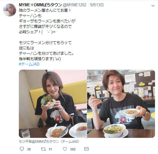 MYMEのツイートでは、仲良くラーメンとチャーハンをシェアしたような印象を受けますが、モツのツイートを見るとMYMEのわがままに付き合わされているような……。